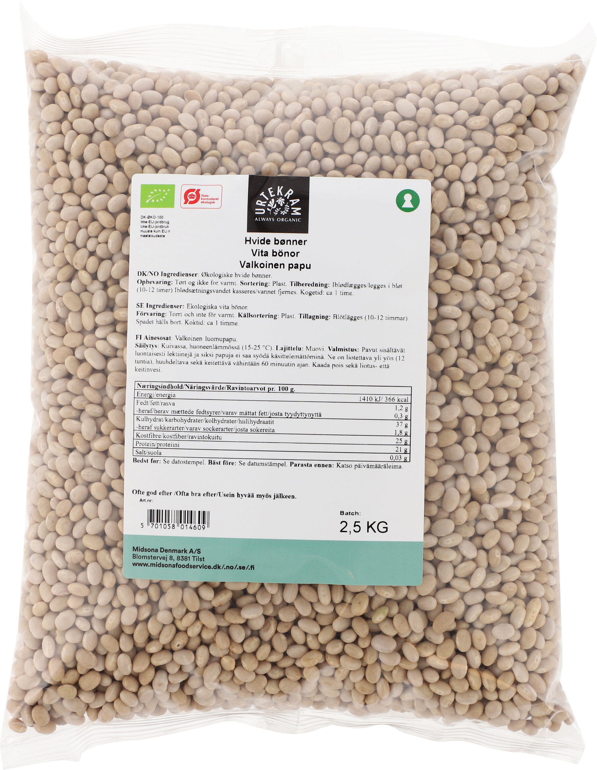 Urtekram hvide bønner smager fantastisk og bidrager med et højt indhold af kostfibre og vegetabilsk protein. Tørrede bønner tilberedt med omtanke er ikke spor kedelige. Bønnerne er gode i supper og sammenkogte retter, marinerede i kolde salater eller blendede med olie og krydderier til en skøn dip til grøntsager og kød. Husk at de tørrede bønner skal iblødsættes i 12 timer og derefter koges i friskt vand i 45-60 minutter. Kassér både iblødsætnings- og kogevandet.