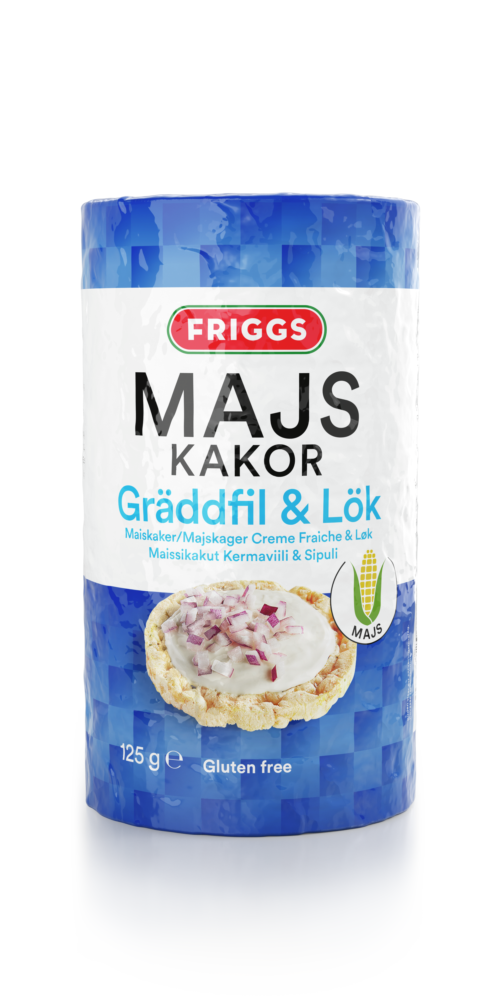 Friggs Majskager Sour Cream & Onion er naturligt glutenfrie majskager med en god smag af creme fraiche og løg. De sprøde majskager kan spises som de er eller toppes med din yndlingstopping. Velegnet som mellemmåltid eller snack uanset hvor du er.