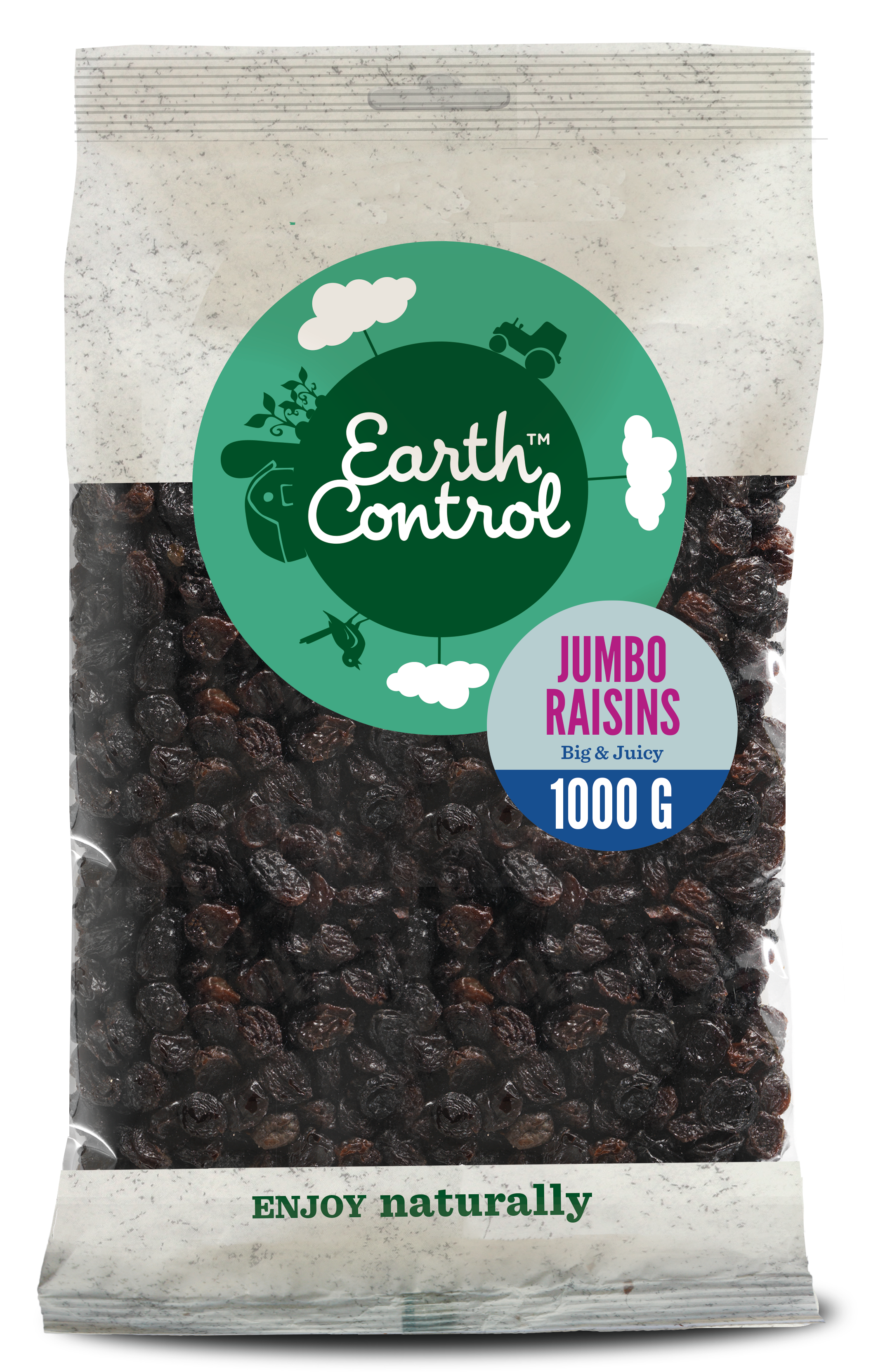 Earth Control jumborosiner dyrkes i den centrale og nordlige del af Chile i Sydamerika, hvor klimaet giver vindruerankerne gode vækstvilkår. Nyd dem lige ud af posen på Skyr, havregryn eller morgengrød og gør din morgen et drys bedre.