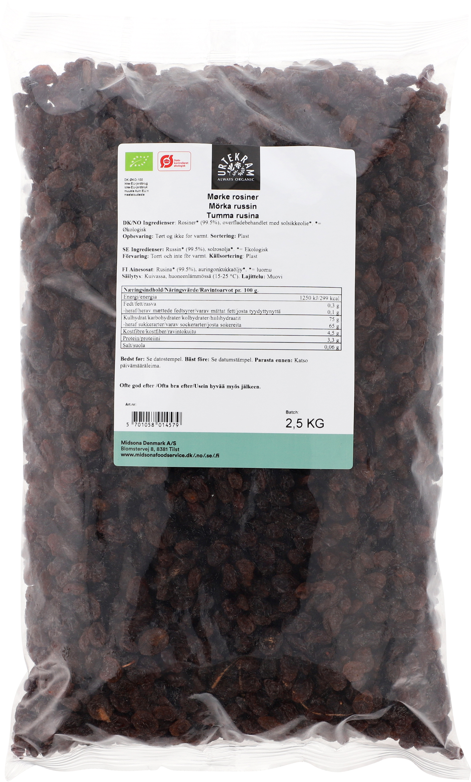 Urtekram økologiske mørke rosiner er klassiske på havregryn, skyr eller til morgengrøden. Vores mørke rosiner er af sorten hompson seedless og starter livet på vinstokkene som saftige, grønne druer. Helt naturligt med solens hjælp ender de som mørke skønheder. Spis dem som snack, til morgenmad eller bland dem f.eks. med hele mandler, kanel og rålakridspulver.